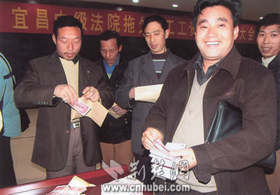2004年12月22日,民工在宜昌中級法院領(lǐng)取執(zhí)行回的工錢。