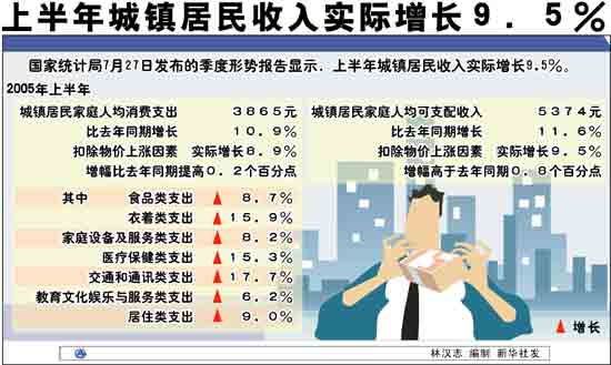 國(guó)家統(tǒng)計(jì)局進(jìn)行的抽樣調(diào)查顯示,上半年城鎮(zhèn)居民家庭人均可支配收入為5374元,比去年同期增長(zhǎng)11.6%,扣除物價(jià)上漲因素,實(shí)際增長(zhǎng)9.5%,增幅高于去年同期0.8?jìng)(gè)百分點(diǎn)。