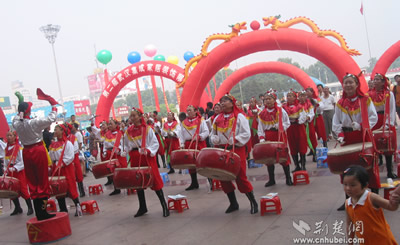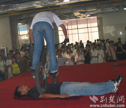 武漢市首屆時(shí)尚體育博覽會(huì)開幕式現(xiàn)場(chǎng)來(lái)自硚口區(qū)漢水橋街威風(fēng)鑼鼓隊(duì)在開幕式上進(jìn)行精彩的表演賽車俱樂(lè)部的車手和車模亮相東方神馬騎士俱樂(lè)部漂亮神氣的女騎士健身教練在進(jìn)行健身表演極限單車高手有驚無(wú)險(xiǎn)的表演