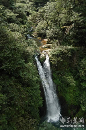 參觀完兩處紅色旅游景點之后,記者們順道觀光了龍?zhí)讹L(fēng)景區(qū)。龍?zhí)段挥诖钠何鞅逼吖,是近年來開發(fā)的以自然與人文景觀相結(jié)合的旅游風(fēng)景區(qū)。據(jù)介紹,當(dāng)?shù)氐奈迳窈邮驱執(zhí)丁拔逄妒似佟钡脑慈。溪水沖擊小井峽谷后,陡然跌落絕壁之下,又連續(xù)飛下四級斷崖,形成梯狀的五個氣勢磅礴的瀑布和深潭,這就是碧玉、金鎖、珍珠、飛鳳、玉女等五潭五瀑。細察五潭,碧水泱泱,樹影幢幢,崖壁如刀削斧鑿,崖腳怪石,汀芷競秀,綠蔭覆蓋四周。仰觀五瀑,潭潭無俗水,瀑瀑似神女。