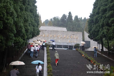 進門后,展現(xiàn)在人們眼前的是109級臺階,威嚴(yán)肅穆的紀(jì)念堂就矗立在山頂上。導(dǎo)游小姐告訴記者,這些臺階分為兩組,第一組49級,象征1949年新中國成立。第二組60級,寓意陵園是在井岡山革命根據(jù)地創(chuàng)建六十周年的1987年建成。