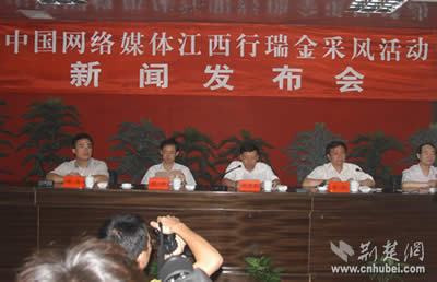 荊楚網(wǎng)消息 記者姚啟慧報(bào)道:12日晚,第二屆中國(guó)網(wǎng)絡(luò)媒體江西行采訪團(tuán)抵達(dá)共和國(guó)搖籃瑞金。13日上午,瑞金市舉行隆重的記者招待會(huì),瑞金市委書記肖毅親自向采訪團(tuán)記者推介紅色故都瑞金,市長(zhǎng)楊中茂主持會(huì)議。