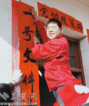 稅費(fèi)改革后的漢川農(nóng)民興高采烈貼對聯(lián)。本報(bào)記者王成鋼攝