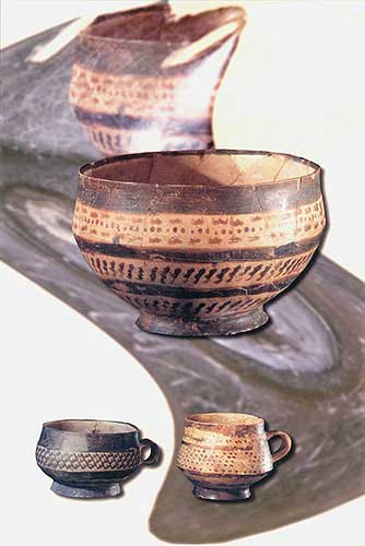 單耳彩陶杯:水器(左下,高6厘米,右下,高8.5厘米)