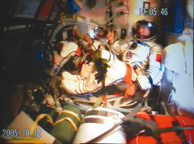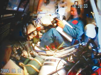 17時(shí)29分,航天員向地面飛控中心報(bào)告飛船工作正常,已做好開(kāi)啟返回艙艙門的準(zhǔn)備。在得到地面指揮員的指令后,費(fèi)俊龍打開(kāi)返回艙艙門,在聶海勝的幫助下進(jìn)入軌道艙工作。