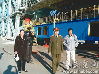 發(fā)射完畢后,酒泉衛(wèi)星發(fā)射中心參謀長(zhǎng)吳年生帶領(lǐng)湖北老鄉(xiāng)參觀(guān)發(fā)射架。本報(bào)通訊員李福元攝