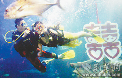 (cnhubei.com) A underwater group wedding ceremony was held in East Lake Ocean World Park of Wuhan, capital of central China’s Hubei Province on October 13, 2005.