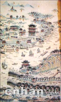 此圖藏于大連市圖書館,手繪彩圖。未標(biāo)明作者姓名和成圖時間,圖中標(biāo)注了武昌、漢口“龍王廟”等。筆者鑒定此圖為清代中期作品,根據(jù)是圖中有“龍王廟”,而龍王齋建于乾隆四年(1739年),故此圖當(dāng)于1739年以后所繪。但圖中沒有出現(xiàn)漢口城堡,而漢口城堡建于1864年,同時圖中只繪有木帆船,而未出現(xiàn)現(xiàn)近代輪船。武漢江面出現(xiàn)航運(yùn)和輪船是1862年以后?芍,此圖當(dāng)成于1862年前。可大體界定此圖繪于1739年至1862年之間。