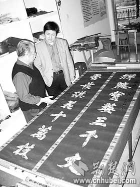 荊楚網(wǎng)消息(楚天都市報(bào))(記者何君輝)昨日,收藏者王先生在漢繡傳人任本榮家中,展示了自己珍藏的一幅刺繡對聯(lián)。對聯(lián)長2.4米,以花朵圖案拼接出“輝騰寶婺三千丈香發(fā)琪花十萬枝”字樣。王先生說,自己十多年前在地?cái)偵匣?00元購得這件繡品,一直沒有機(jī)會為它“驗(yàn)明正身”