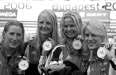 7月31日,在歐洲游泳錦標(biāo)賽女子4×100米自由泳接力決賽中,德國隊(duì)以3分35秒22的成績奪得冠軍,并打破了澳大利亞隊(duì)2004年創(chuàng)造的3分35秒94的世界紀(jì)錄。圖為德國選手達(dá)爾曼(左二)、格茲(右)、斯特芬(右二)和利普在頒獎儀式上。