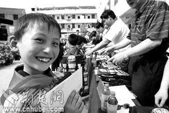 我省2005年春季“希望工程助學進城計劃———金龍魚農民工子女助學金”本月起開始陸續(xù)發(fā)放,1000余名在漢打工的農民工子女可獲得每學期300元的資助款。預計五年內,我省將有4000人次的農民工子女獲此項資助。圖為武漢市東升學校二年級的李灣小朋友領到助學金后高興地笑了。