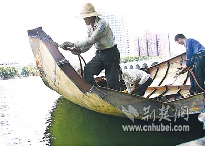 “船太大了,沒辦法運出城,只好進行分解后運走!必撠(zé)現(xiàn)場施工的馬先生解釋,2002年初,他所在的公司承攬東湖清淤工程,共運來8條清淤船,其中一條船放置在水果湖。當(dāng)時,經(jīng)有關(guān)部門批準(zhǔn),這些船由大型車輛運來并吊入湖中。目前清淤工程結(jié)束,湖中的船不好運走,只好割成一塊塊鋼板,當(dāng)成廢鋼賣掉。