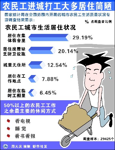 雖然生活條件普遍較差,勞動強度大,社會保障差,文化娛樂少,但多數農民工仍然認可目前在城市的生存現狀,對未來生活充滿希望。國家統計局25日發(fā)布的一項調查結果中這樣說。