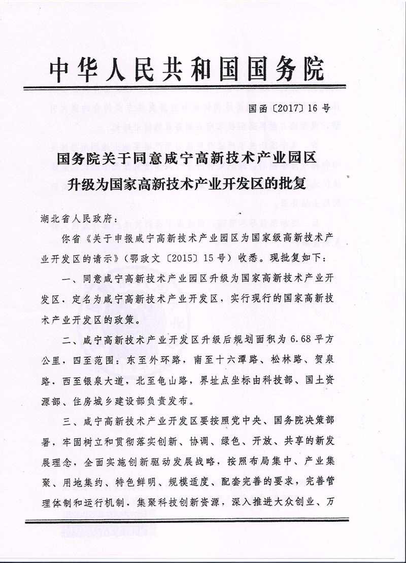 你省《關(guān)于申報(bào)咸寧高新技術(shù)產(chǎn)業(yè)園區(qū)為國(guó)家級(jí)高新技術(shù)產(chǎn)業(yè)開(kāi)發(fā)區(qū)的請(qǐng)示》(鄂政文〔2015〕15號(hào)) 收悉?,F(xiàn)批復(fù)如下:
