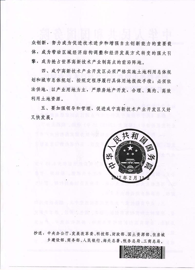 《國(guó)務(wù)院關(guān)于同意咸寧高新技術(shù)產(chǎn)業(yè)園區(qū)升級(jí)為國(guó)家高新技術(shù)產(chǎn)業(yè)開(kāi)發(fā)區(qū)的批復(fù)》