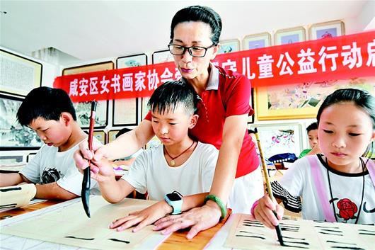 湖北日報訊 今年暑假,咸寧留守兒童有了新去處,該市一批書道精湛、和藹可親的女書法家免費(fèi)教他們學(xué)習(xí)書法。咸寧市咸安區(qū)女書畫家協(xié)會去年成立,一直堅持周末及寒暑假設(shè)立兩處書法授課點,對周邊留守兒童免費(fèi)開放。(記者劉曙松 視界網(wǎng)李旻媛 攝)