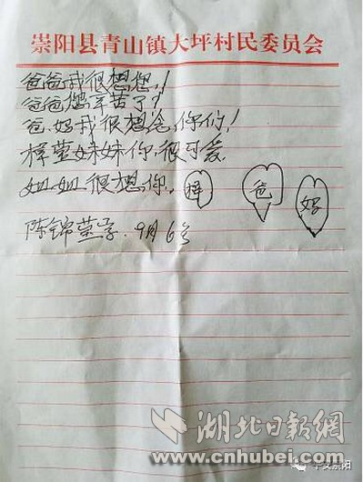 薄薄的信紙上筆跡稚嫩,一筆一劃卻還工整,落款為“陳錦瑩字,9月6號”,在信紙上還用畫了三顆心,里面分別寫著“梓”、“爸”、“媽”。