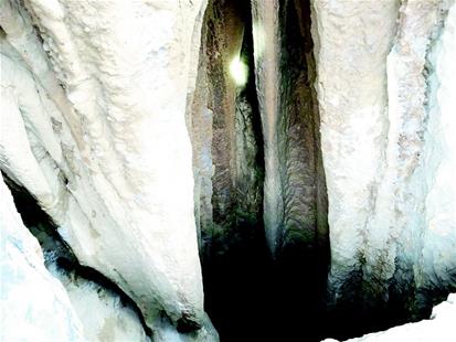 其中一個(gè)溶洞位于界水嶺村四組,小地名叫獅子磅,因山包上一塊巨石酷似仰天長(zhǎng)嘯的獅子而得名,洞口就在新修的路邊。楚天都市報(bào)記者看到,挖開的洞口直徑約60厘米,里面深不見底,記者試著丟了塊石頭,只聽見一連串石頭撞擊洞壁的聲音。村民找來強(qiáng)光電筒,依然無法探到底。記者看到,洞壁上盡是石鐘乳,向洞底延伸不見終端,洞壁上有幾處石鐘乳呈人形。