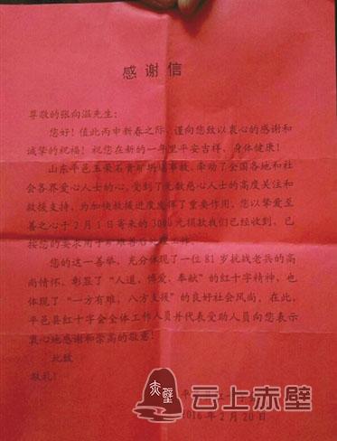 “尊敬的張向溫先生,您寄來的3000元捐款我們已經(jīng)收到,在此,平邑縣紅十字會全體工作人員并代表受助人員向您表示衷心地感謝和崇高的敬意……”這是山東省平邑縣紅十字會于2016年給張向溫寄的感謝信中的一段話。