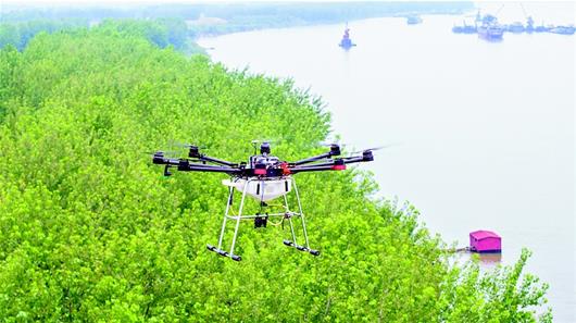 湖北日?qǐng)?bào)訊 6月12日,在嘉魚縣長(zhǎng)江干堤陸溪段,無人機(jī)在防浪林上空噴灑低毒無殘留農(nóng)藥,防治病蟲害。近期,嘉魚段長(zhǎng)江防浪林出現(xiàn)了蟲卵和幼蟲,嘉魚縣林業(yè)局迅速進(jìn)行綜合防治,全面維護(hù)從陸溪至簰洲灣109公里長(zhǎng)江沿線及洲灘6萬余畝楊樹林。