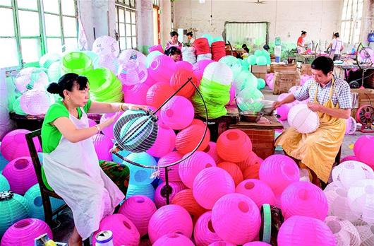 7月17日,崇陽縣銀豐工藝有限公司工人在制作紙燈籠。崇陽縣沙坪鎮(zhèn)素有手工制作燈籠的傳統(tǒng),該企業(yè)現(xiàn)有200多名職工,以周邊鄉(xiāng)村的婦女為主,其手工制作的金粉燈籠遠(yuǎn)銷歐洲、北美、東南亞等地區(qū)的20多個(gè)國家,今年上半年完成1100多萬元的訂單。(視界網(wǎng) 黎志遠(yuǎn) 汪佳 攝)