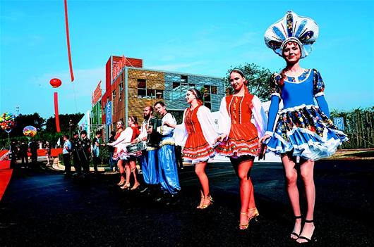 當(dāng)日,經(jīng)過一年多時(shí)間建設(shè)的“萬畝茶園·俄羅斯方塊小鎮(zhèn)”揭開面紗。茶園入口,彩球飛揚(yáng)、人流如織,俄羅斯少女翩翩起舞。走入茶園,齊腰的茶樹漫山遍野、油綠發(fā)亮,異域風(fēng)情的商業(yè)街、喀秋莎會客廳、四季茶溪花海令人眼前一亮。萬畝茶園原是羊樓洞茶場砂子嶺分場所在地,連片的茶園超過萬畝,主要用于制作青磚茶,是赤壁聞名的旅游地標(biāo)之一。重新規(guī)劃建設(shè)的萬畝茶園,預(yù)計(jì)總投資5.4億元,擺脫原有單一茶業(yè)種植,瞄準(zhǔn)建設(shè)全球首家茶文化俄羅斯風(fēng)情主題公園。