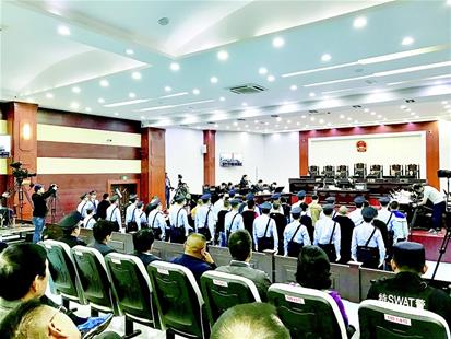 前日上午,庭審開始,23名涉黑團伙成員集體站在被告席上,出于部分被告身體不適,審判長讓被告人坐下聽庭。