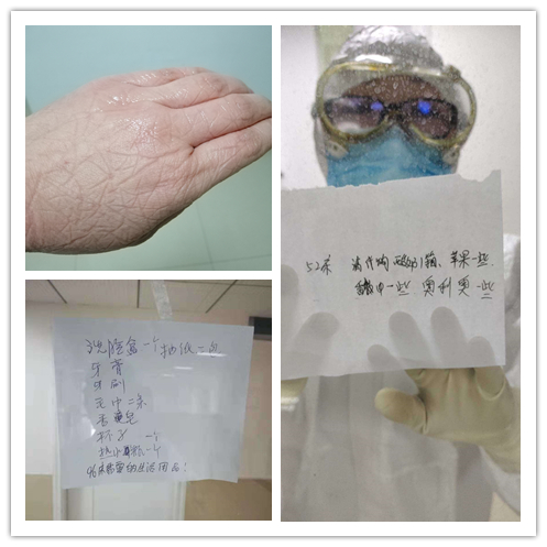 他們負責隔離患者的日常治療和護理,每天6個小時一次的輪班,穿上隔離服,她們就進入緊張而有序的工作狀態(tài)。因為穿、脫隔離服有著嚴格的操作流程和要求,所以不能夠喝水,穿著隔離服不方便上廁所。每天她們要做多種檢測和病情的記錄,身心處于高度戒備狀態(tài)的同時,還必須時刻密切關注病患的心理變化,安撫病患的情緒。