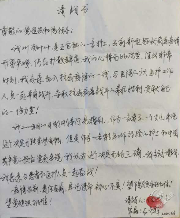 剛剛新婚,主動放棄婚假,遞交請戰(zhàn)書,請求奔赴抗疫前線,貢獻自己的一份力。市人民醫(yī)院預(yù)備黨員、護士湯葉葉在請戰(zhàn)書中這樣寫道:“疫情當(dāng)前,責(zé)任在肩,牢記使命,初心不變!”