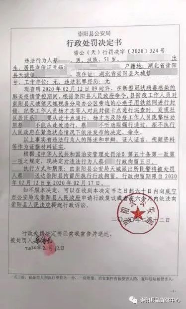 目前,蔡某因拒不執(zhí)行全縣疫情防控期間的禁令,被警方依法處以行政拘留5日的處罰。