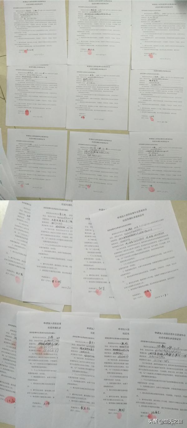 萬一感染了病毒怎么辦?早在成立崇陽縣青年志愿者協(xié)會抗疫先鋒隊時,沈增平就第一個帶頭和隊員們一起簽下了承諾保證書“個人知悉所有風險和自愿承擔一切責任,抗疫值勤過程中,如果不幸感染病毒,積極接受和配合政府部門及醫(yī)院的隔離和治療;服從抗疫先鋒隊黨組織的領導,不怕犧牲......”并按下了一個個鮮紅的手印。