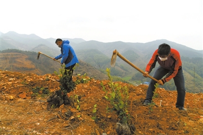 塘湖鎮(zhèn)閣壁村鳳形山上,在新開墾的油茶基地里,幾十位工人戴著口罩正忙著打窩、放苗、培土。