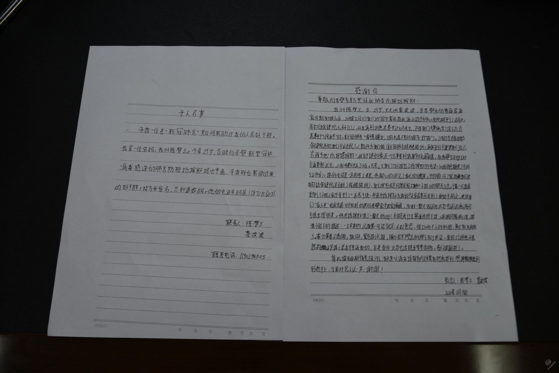 夫妻二人一直對(duì)這位胡姓同志十分感激,2月18日,陳夢(mèng)云給市疫情防控指揮部寫了一封感謝信,同時(shí)希望他們能幫忙找到那位胡姓同志以便表示感謝。經(jīng)過一個(gè)半月的尋找,4月6日,夫妻二人終于得知——胡明浩,市衛(wèi)健局人事股科員,于是給其所在市新冠肺炎疫情防控指揮部送上錦旗。