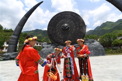 11日,通城縣大坪鄉(xiāng)內(nèi)沖瑤族村瑤望千年廣場(chǎng),游客身著鮮艷服裝,開始錄制抖音。