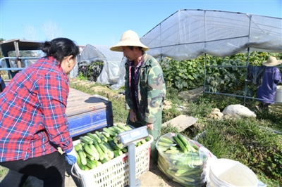 12日,咸安區(qū)綠佳綠色蔬菜專(zhuān)業(yè)合作社蔬菜基地,菜農(nóng)將新鮮采摘的黃瓜稱(chēng)重運(yùn)往市場(chǎng)。