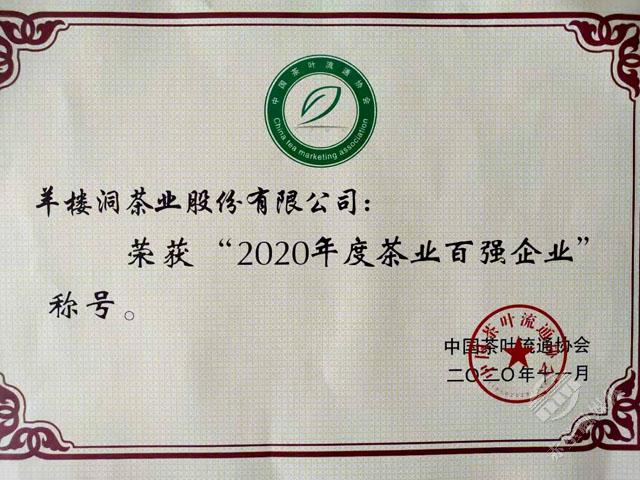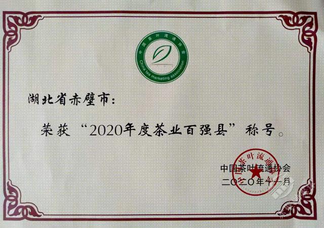 11月18日,第十六屆中國茶業(yè)經(jīng)濟年會正式發(fā)布了2020中國茶葉行業(yè)調(diào)查的最終結(jié)果,對年度中國茶業(yè)優(yōu)秀企業(yè)、優(yōu)秀縣域進行授牌表彰。赤壁市榮獲“十三五百強縣市十強”和“2020年度茶業(yè)百強縣”稱號,其中“十三五百強縣市十強”中赤壁市是湖北省唯一入選的縣市,在“2020年度茶業(yè)百強企業(yè)”評選中,羊樓洞茶業(yè)股份有限公司成為咸寧市唯一入選的企業(yè)。