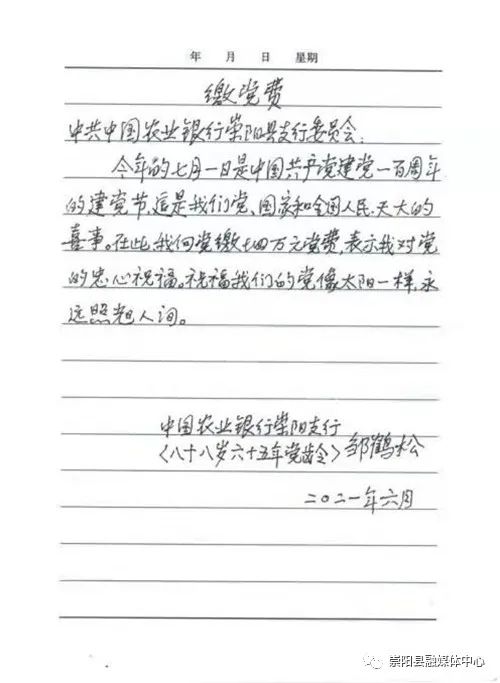 廖海峰告訴記者,來之前,鄒鶴松老人特意向中國農(nóng)業(yè)銀行崇陽支行黨委寫了一封信,信里這樣寫著:“今年是中國共產(chǎn)黨建黨100周年,這是我們黨、國家和全國人民天大的喜事。在此,我向黨繳納4萬元黨費(fèi),表示我對黨的衷心祝福。祝福我們的黨像太陽一樣,永遠(yuǎn)照耀人間?!币痪渚浜唵螛銓嵉恼Z言,彰顯著一名老黨員赤心向黨、一心為黨樸實而偉大的情懷。