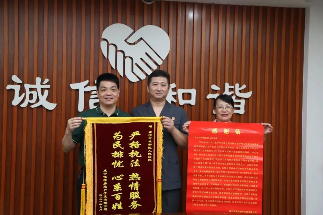 “感謝咸安區(qū)法院,讓我們公司從瀕臨破產(chǎn)的邊緣走回正常經(jīng)營的軌道,幫助我們起死回生......”7月16日下午,咸寧伍恒房地產(chǎn)開發(fā)有限公司(以下簡稱伍恒公司)負責(zé)人將一面寫有“嚴格執(zhí)法,熱情服務(wù);為民排憂,心系百姓”的錦旗和一封感謝信送至咸安區(qū)法院,感謝區(qū)法院執(zhí)行局善意文明執(zhí)行,幫助企業(yè)渡過難關(guān)。