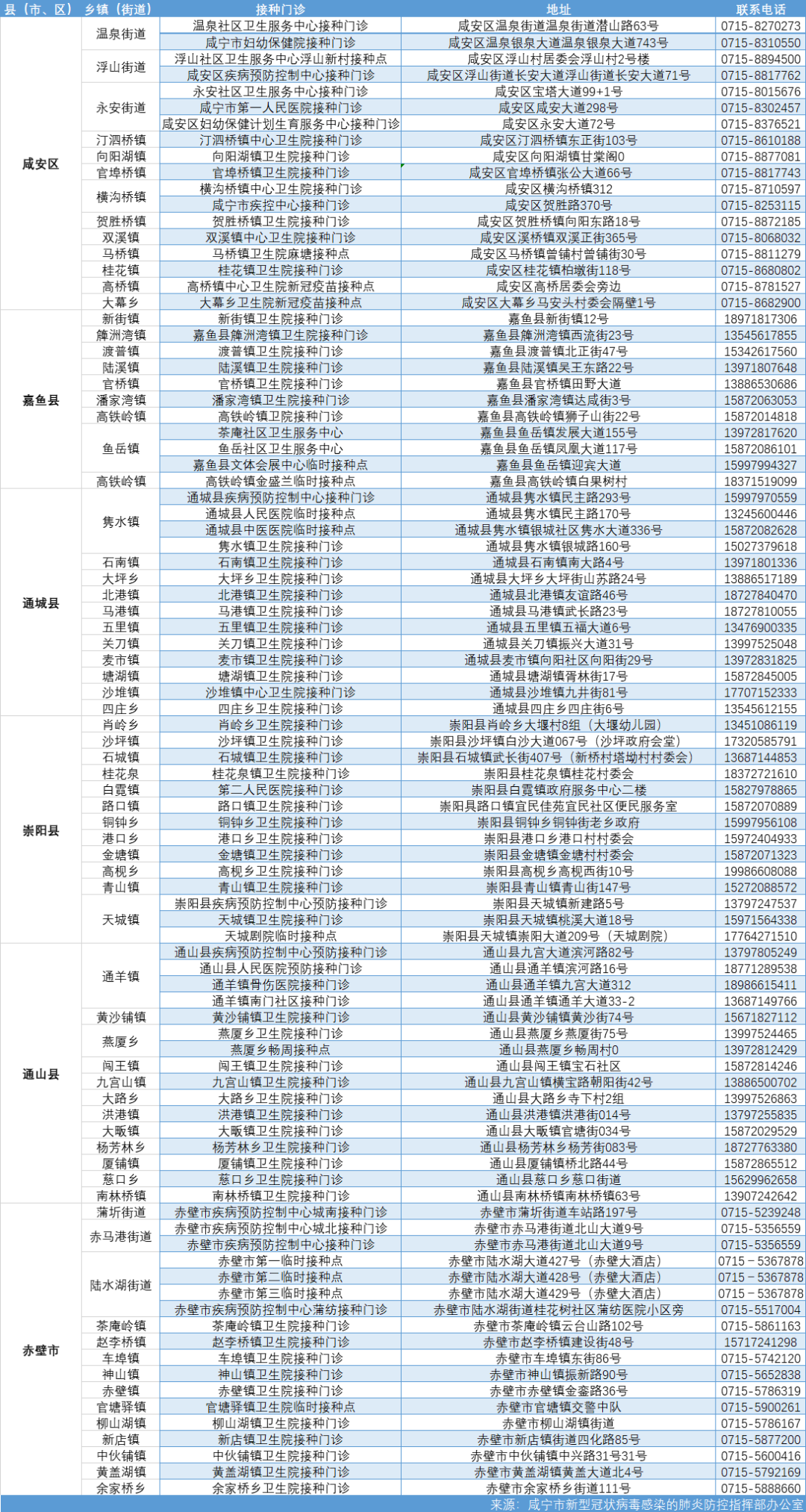 咸寧市新冠疫苗接種門診(點)服務(wù)信息: