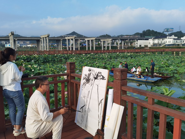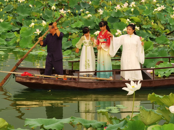 “武當(dāng)可采蓮,蓮葉何田田?!痹谖洚?dāng)山太極湖濕地公園,百畝荷花競相開放,微風(fēng)輕拂,碧波蕩漾,花香四溢,為炎炎夏日增添了詩意。身著漢服的古琴師帶著兩名采蓮少女,泛著小舟,暢游在花海,采摘蓮子和荷葉,為即將制作的消夏納涼荷花茶、消暑湯做準(zhǔn)備,體驗不一樣的大暑節(jié)氣,勾勒出一幅美妙的圖畫。