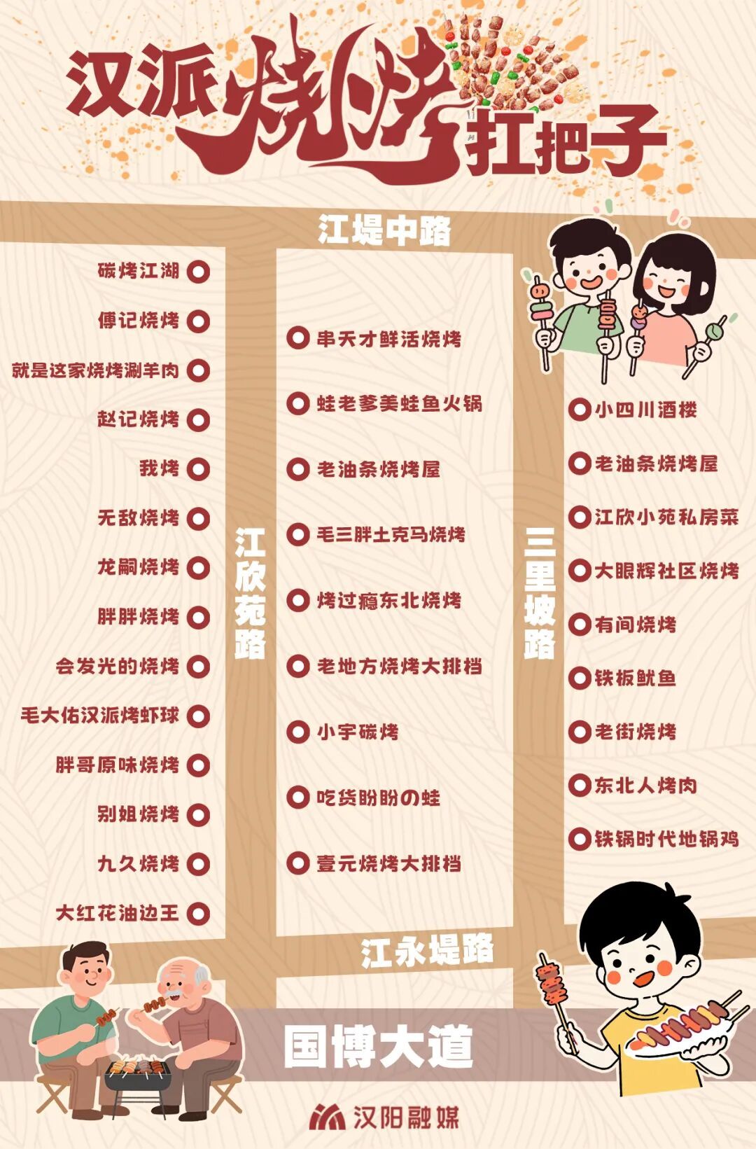 這個周末,不妨約上三五好友,來漢陽江欣苑路赴一場“舌尖上的武林大會”,炭火明滅間,總有一串能治愈你的靈魂,總有一杯酒能讀懂你的故事。