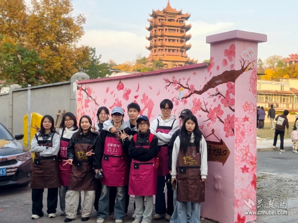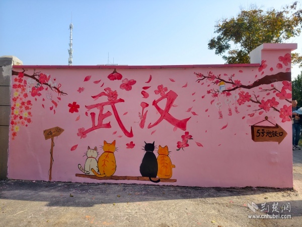 次日,創(chuàng)作進入精修階段。志愿者們細(xì)致調(diào)整“武漢”字樣的色彩飽和度,用粉白顏料層層暈染出飛揚的櫻花花瓣。四只形態(tài)各異的貓咪相依蹲坐,靈動可愛;特意添加的“5號地鐵口”指引牌等實用元素,更讓作品兼具藝術(shù)性與功能性。創(chuàng)作過程中,不斷有居民和游客駐足觀賞,主動詢問設(shè)計理念?!拔覀兿胪ㄟ^櫻花、貓咪等元素,展現(xiàn)武漢的浪漫與煙火氣?!敝驹刚咭贿呎{(diào)色一邊向圍觀群眾講解。
