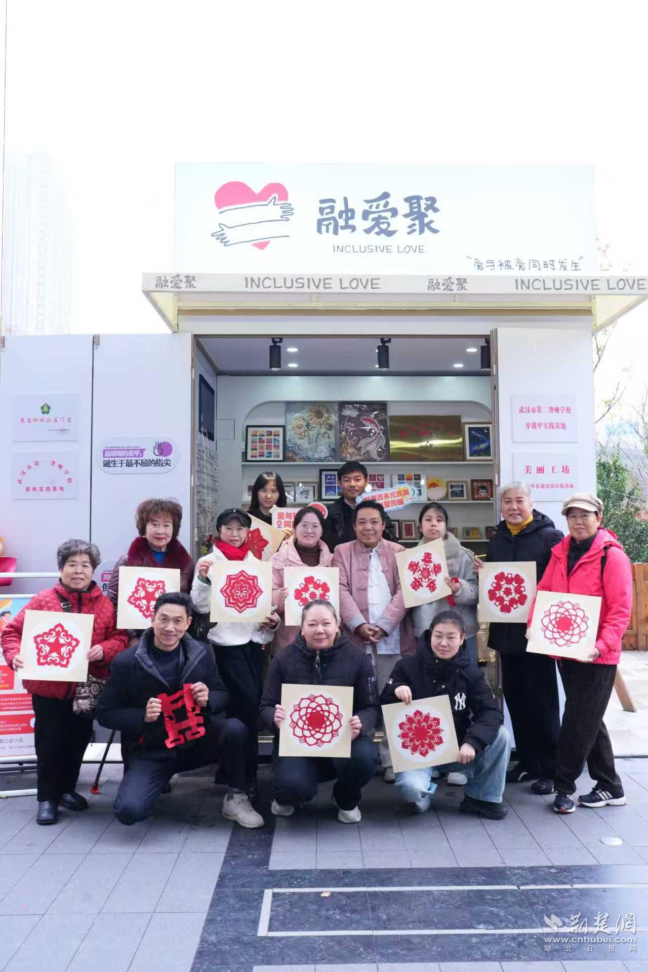 活動當(dāng)天,武漢剪紙非遺傳承人、湖北省工藝美術(shù)大師葛海現(xiàn)場展示并手把手教授以“融愛萬家”為主題的剪紙作品。來自黃陂“美麗工坊”的朱熙老師也帶來了編繩技藝,與居民面對面交流。