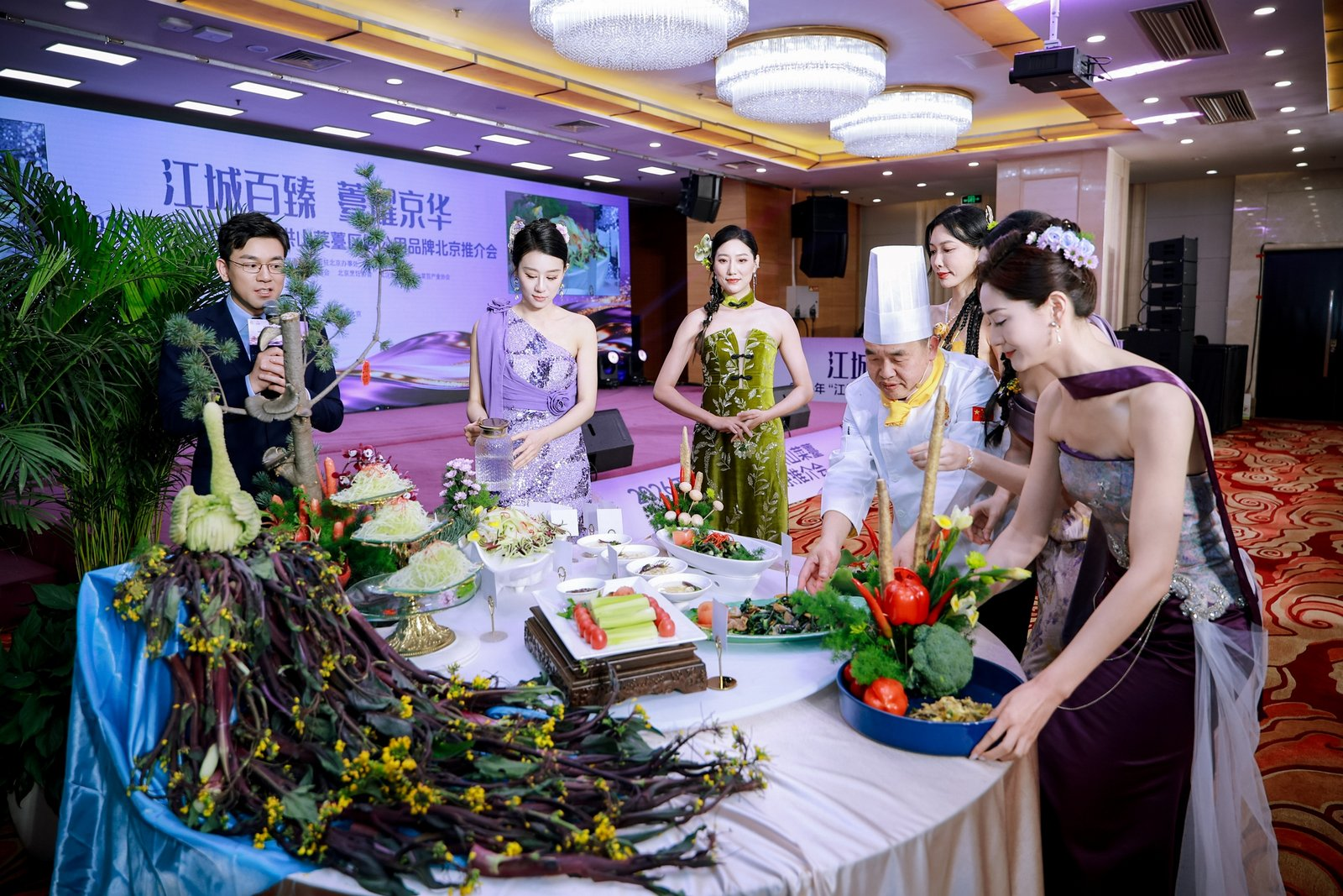 活動(dòng)現(xiàn)場(chǎng),《千年一“薹”,京誠(chéng)所愛(ài)》情景劇生動(dòng)詮釋洪山菜薹的傳承與創(chuàng)新,產(chǎn)品走秀與藝術(shù)插花表演凸顯其美學(xué)價(jià)值,楚菜名廚現(xiàn)場(chǎng)演繹“一薹多吃”宴席,展現(xiàn)菜薹融入京鄂風(fēng)味的烹飪創(chuàng)意。京城網(wǎng)紅大廚隋坡登臺(tái)品鑒,為洪山菜薹實(shí)力“打call”?,F(xiàn)場(chǎng)同步設(shè)置國(guó)風(fēng)市集,展出鮮薹、鎖鮮產(chǎn)品及禮盒,供嘉賓品鑒體驗(yàn)。