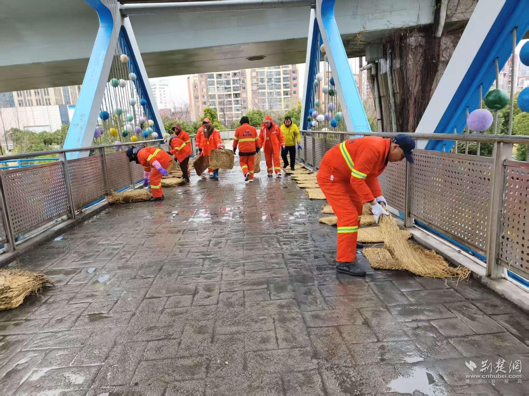 防滑措施同樣向行人集中區(qū)域延伸。19日17時(shí)起,吳家山環(huán)山路人行天橋上,環(huán)衛(wèi)工人與執(zhí)法隊(duì)員開(kāi)始鋪設(shè)防滑草墊?!皹騼蓚?cè)是學(xué)校,晚高峰和早高峰人流集中,提前鋪設(shè)能減少滑倒風(fēng)險(xiǎn)。”吳家山街綜合執(zhí)法中心副主任陳偉說(shuō)。