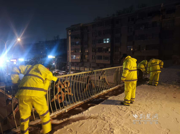1月19日深夜至20日凌晨,隨著雪勢(shì)加大,街道應(yīng)急搶險(xiǎn)隊(duì)伍迅速化身“風(fēng)雪夜行人”,頂著嚴(yán)寒奔赴一線。他們采取機(jī)械作業(yè)與人工作業(yè)相結(jié)合的方式,對(duì)轄區(qū)主次干道、橋梁、陡坡、十字路口等重點(diǎn)路段和易結(jié)冰區(qū)域,進(jìn)行循環(huán)撒布融雪鹽和清掃作業(yè),最大限度預(yù)防道路結(jié)冰。寒夜中,隊(duì)員們衣衫被雪花浸濕,臉頰被寒風(fēng)凍紅,但無(wú)人退縮,持續(xù)堅(jiān)守。天色微明,雪勢(shì)稍歇,隊(duì)伍立即轉(zhuǎn)戰(zhàn),對(duì)背街小巷、人行道、天橋等區(qū)域的殘留積雪進(jìn)行清理,并在坡道、臺(tái)階等易滑處鋪設(shè)防滑草墊、設(shè)置警示標(biāo)識(shí),全力保障早高峰出行安全順暢。