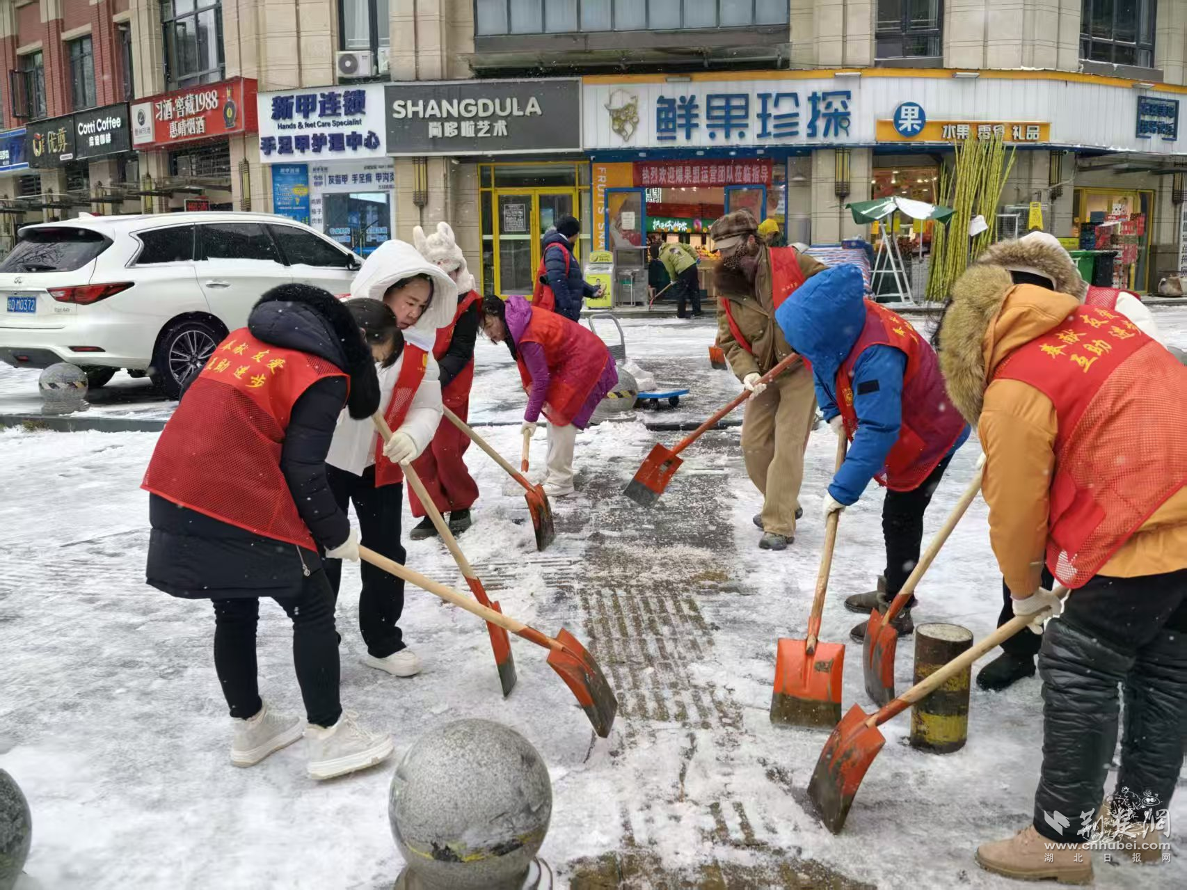 陳家墩社區(qū)則結(jié)合老舊小區(qū)多、坡道多的實際情況,提前明確分片包干責(zé)任,將單元門口、背街小巷和易結(jié)冰路段列為重點區(qū)域,組織街道工作人員與社區(qū)黨員志愿者、熱心居民并肩作戰(zhàn)。雪花落滿肩頭、化成水珠,大家卻顧不上拍一拍,鏟一鍬、掃一段、清一處,干勁十足?!翱吹铰访嫔戏e雪都清理干凈了,才放下心來。”