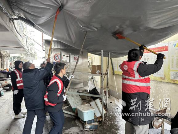 除雪過程中,工作人員發(fā)現(xiàn)一處老舊小區(qū)宿舍門前遮雨棚因積雪堆積嚴(yán)重變形,存在垮塌隱患。大家立即分工協(xié)作,有的手持長桿清理棚頂積雪,有的在下方拉起警戒線、疏導(dǎo)居民通行,及時消除了高空墜物風(fēng)險,為居民撐起一把“安全傘”。