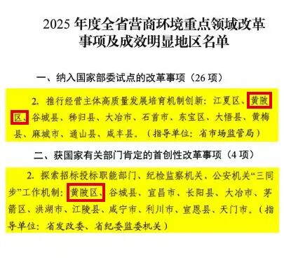 近日,湖北省優(yōu)化營商環(huán)境領(lǐng)導(dǎo)小組對2025年度全省優(yōu)化營商環(huán)境重點(diǎn)領(lǐng)域改革事項(xiàng)及成效明顯地區(qū)進(jìn)行通報(bào)表揚(yáng)。其中,黃陂政務(wù)服務(wù)領(lǐng)域兩項(xiàng)創(chuàng)新改革納入國家部委試點(diǎn),獲國家有關(guān)部門肯定,彰顯區(qū)域改革擔(dān)當(dāng)與服務(wù)實(shí)力。