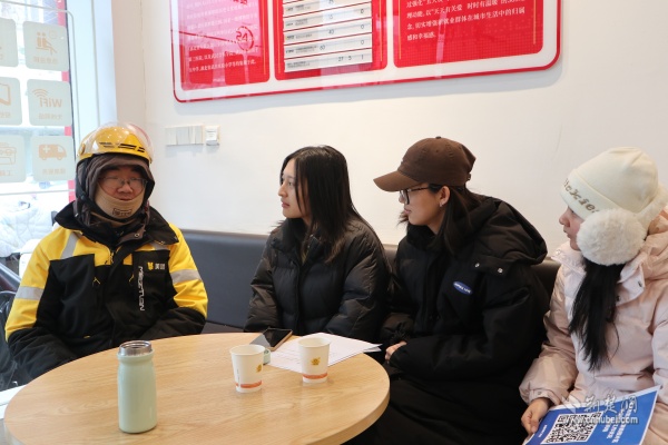調(diào)研期間,實踐隊在街道統(tǒng)籌安排下,深入街道新就業(yè)群體服務(wù)驛站、新業(yè)態(tài)站點及“暖新聯(lián)盟”商家,通過實地走訪、座談交流、問卷調(diào)研等形式,與一線騎手、站點負(fù)責(zé)人、社區(qū)工作者面對面溝通。他們詳細(xì)了解新就業(yè)群體工作生活狀況、現(xiàn)實需求與參與基層治理意愿,重點調(diào)研志愿積分激勵、“五大員”培育、“黃小蜂助老送餐隊”等特色項目的運行成效。街道以服務(wù)型治理搭建信任紐帶、引導(dǎo)新就業(yè)群體融入基層治理的工作模式,為高校專業(yè)研究提供了鮮活的實踐樣本。